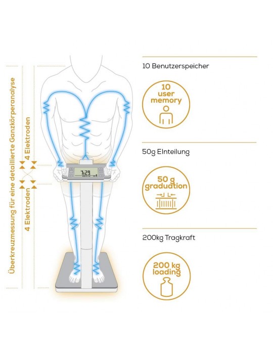 Yeni BF 1000 Süper Precision el ve ayaklar için toplam 8 elektrot ve özel çapraz ölçüm ile kilonuza ek olarak, vücut yağı, viseral (karın bölgesi) yağ ve vücut suyu, kas yüzdesi, kemik kütlesi ve kalori gereksinimlerini de gösterir.