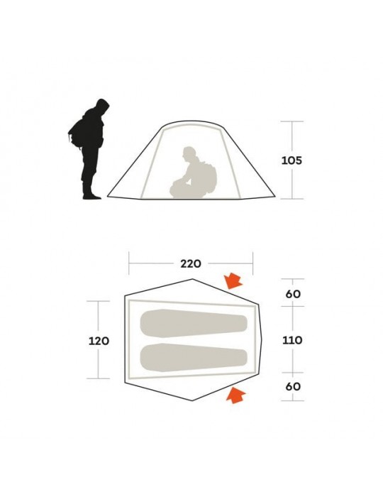 Dış Tente: 50D Naylon Double Ripstop (çift yönlü yırtılmaz), 75 g/m²; ısı yalıtımlı alüminize poliüretan kaplama, 3.000 mm su geçirmezlik, FR (alev geciktirici) işlem görmüş.